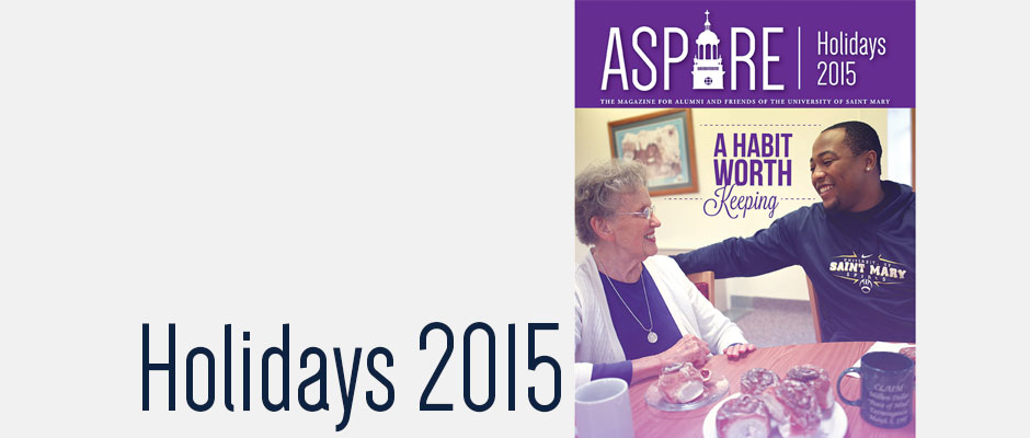Holidays 2015 Posted on December 1, 2015 by University of Saint Mary in Print Editions // 1 Comment Letter from the President A Saint Mary Story: Alex Bartels, U’15 View from the Spire 10 Things We Love Join in the Mabee Challenge CHAIRished Memories! Sr. Sue Miller Honored Monthly eAspire Feature Story: A Habit Worth Keeping Alumni Corner: Class Notes In Memoriam Alumni News Nominate an Alum for a Special Honor Alumni Calendar Share this: Click to share on X (Opens in new window) X Click to share on Facebook (Opens in new window) Facebook Like Loading... Related