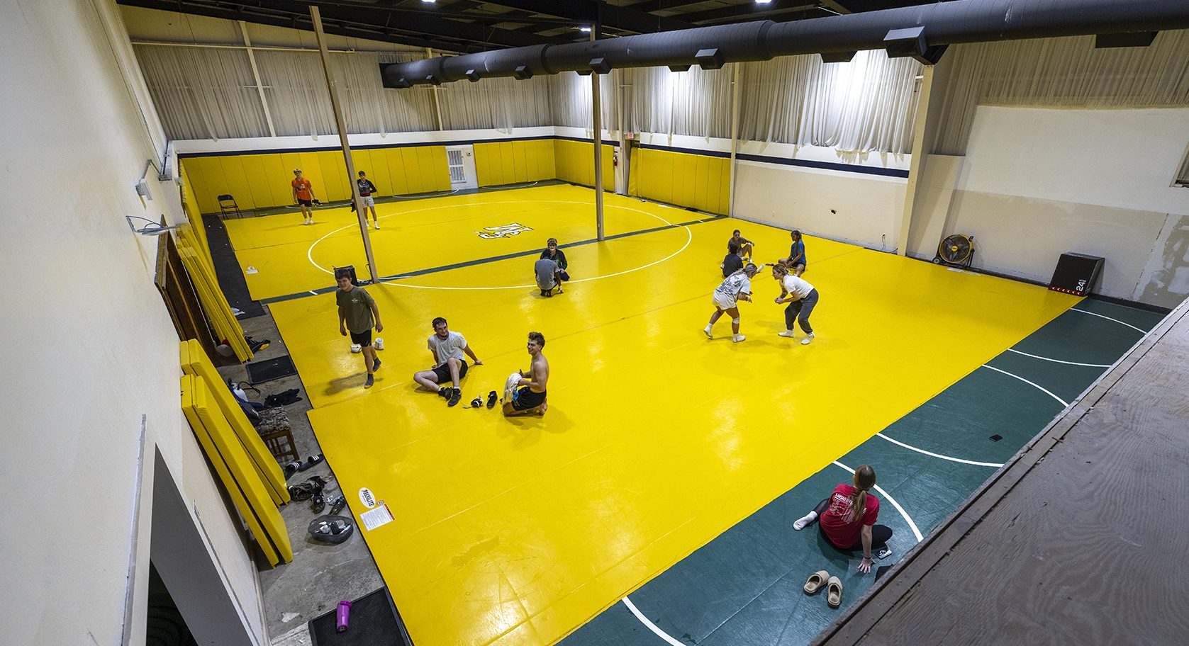 Members of the men's and women's wrestling teams warm up before a practice in their new training facility.