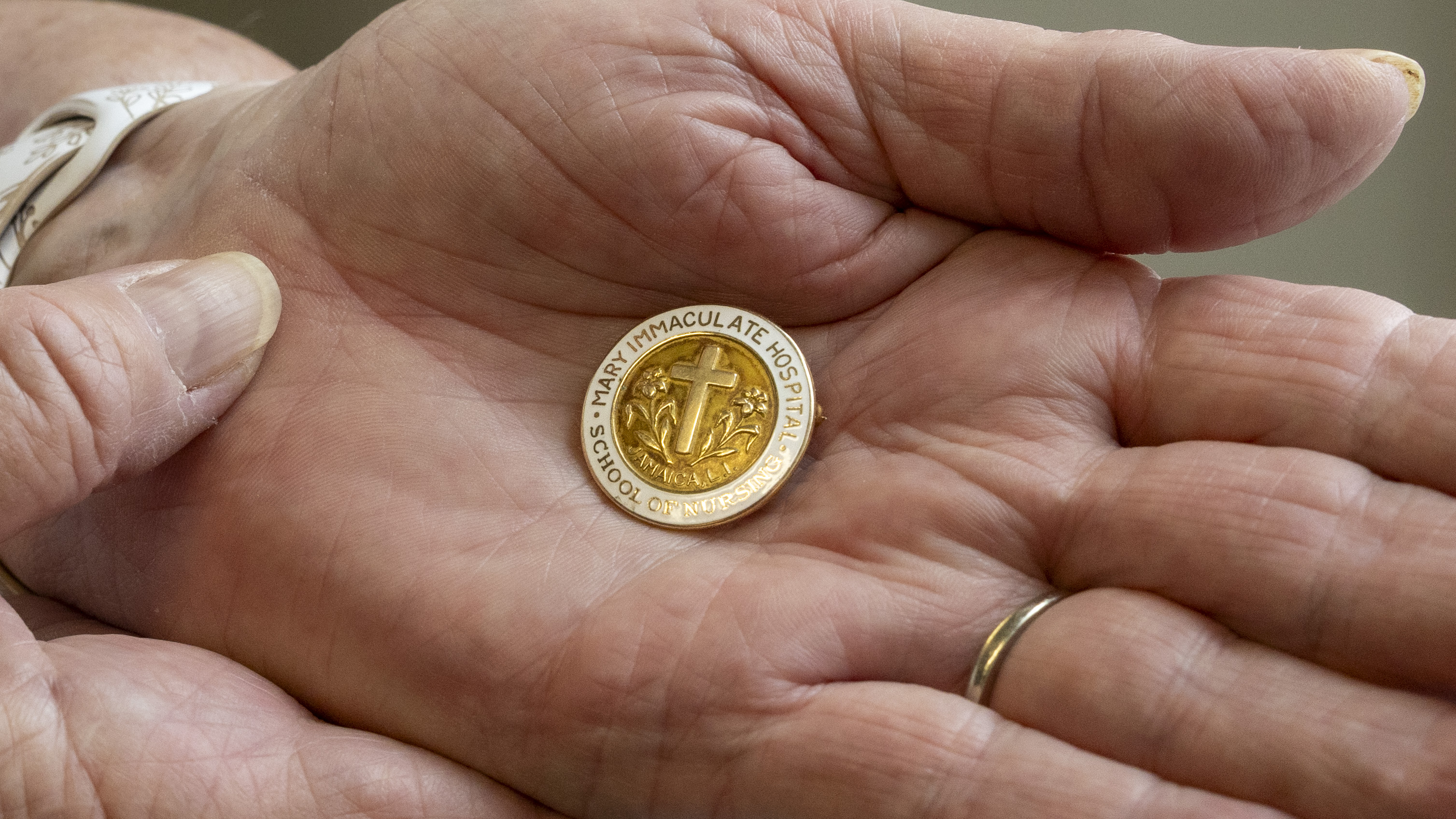 The gold pin represented Ducey’s earliest step in her nursing journey – a symbol of pride from her 1967 diploma program at Mary Immaculate Hospital School of Nursing in Jamaica, New York. With the school long closed, she believed the treasured emblem was lost forever.